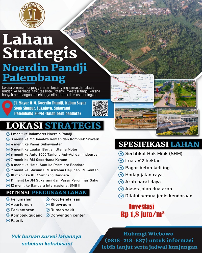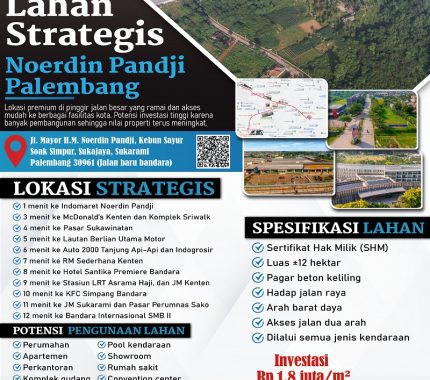 – Alamat Lokasi Tanah: Jl. H.M. Noerdin Pandji 1 Kebun Sayur, Soak Simpur, (Jalan baru bandara) Kel. Sukajaya, Kec. Sukarami, Kota Palembang, Sumatera Selatan 30961