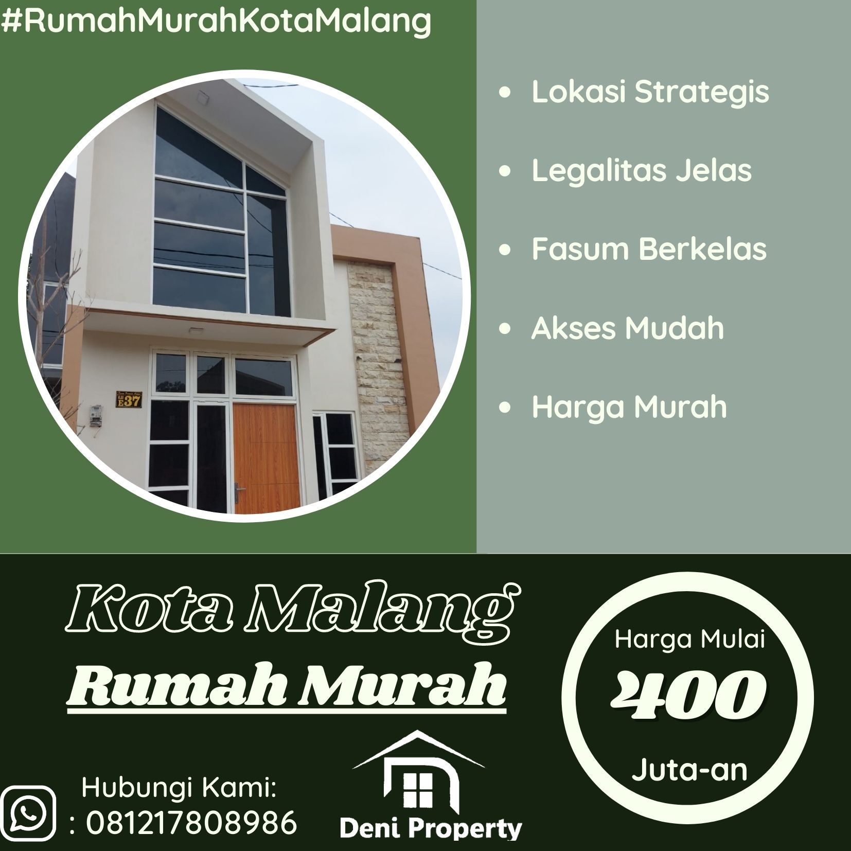 Rumah Murah Minimalis Di Grand Deira Dekat Gor Malang1 / 1DetailTipeRumahLuas bangunan40Luas tanah72Kamar tidur2Kamar Mandi1Lantai1FasilitasGardenCarportPAMSertifikasiSHM – Sertifikat Hak MilikAlamat lokasitlogowaruDeskripsiInvestasi Rumah Seputaran GOR Ken Arok... Selengkapnya)