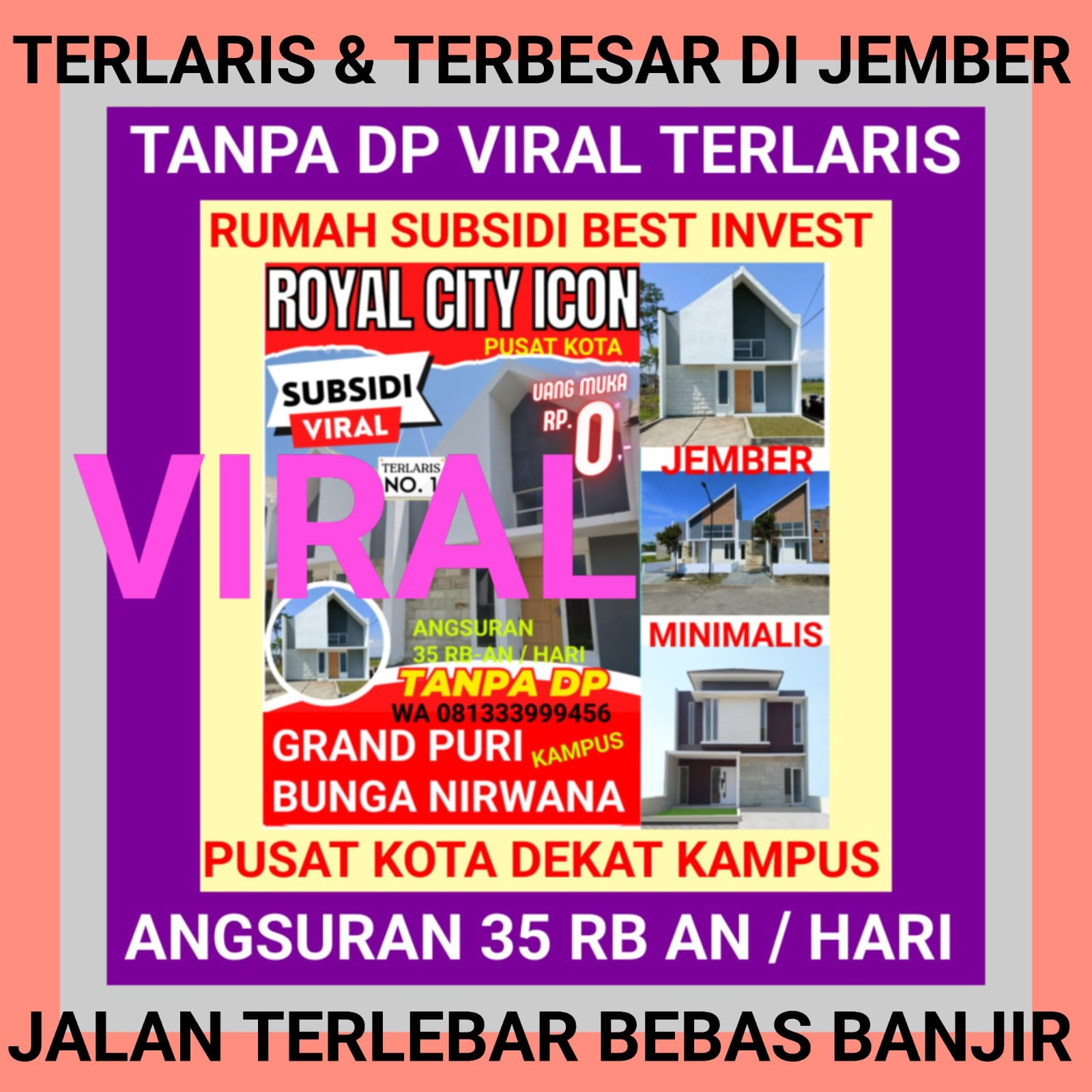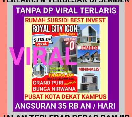 Setelah sukses diserbu pembeli dengan perumahan subsidi minimalis dan terlaris di Wilayah Kampus Jember PURI BUNGA NIRWANA yang telah habis terjual dan terbangun 1000 unit lebih sehingga menjadi perumahan subsidi terbesar di JEMBER.