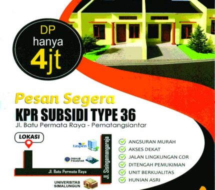 Jual Rumah Subsidi Murah Type 36 (Rumah Baru) di Kota Pematang Siantar Dekat Universitas Simalungun, Dekat RS Rasyida Siantar, Dekat SMK Negeri 1 Pematang Siantar, Dekat Stasiun Siantar, Dekat Pasar Parluasan / Pasar Dwikora, Dekat Pasar Horas Siantar, Dekat Ramayana Siantar, Dekat Taman Hewan Pematang Siantar.